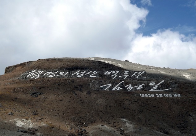 ヒャンド峰の頂には、「革命の聖なる山ペクトゥ山 金正日」という総書記の直筆が刻まれています。朝鮮人民は、ペクトゥ山を革命の聖なる山として永遠に輝かせる気高い意志が込められた総書記のこの直筆をヒャンド峰の斜面に刻みました。総書記の直筆に、ペクトゥ山の息子に生まれ、ペクトゥ山の胆力で自主の旗高く朝鮮を輝かせた総書記の革命的生涯と不滅の業績が思い起こされ、厳かな気持ちになります。