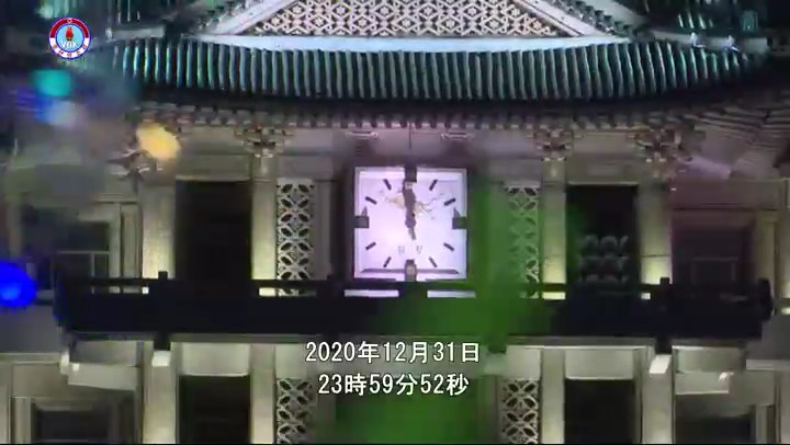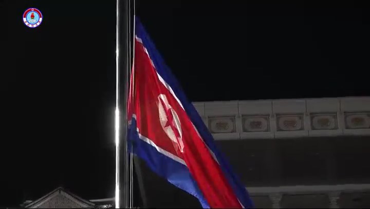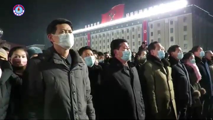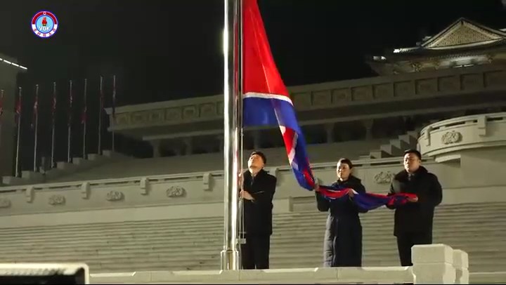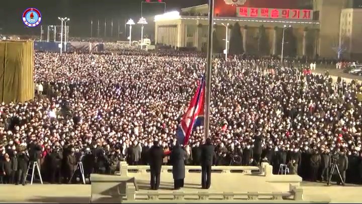チュチェ110年(2021)を告げる鐘が鳴り、歌「愛国歌」のメロディーが鳴り響く中、国旗掲揚式が行われています。
