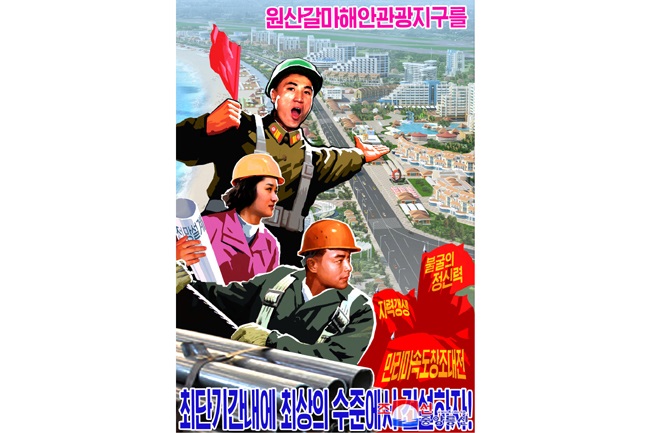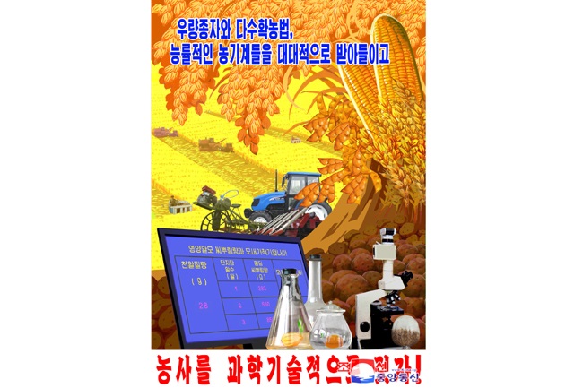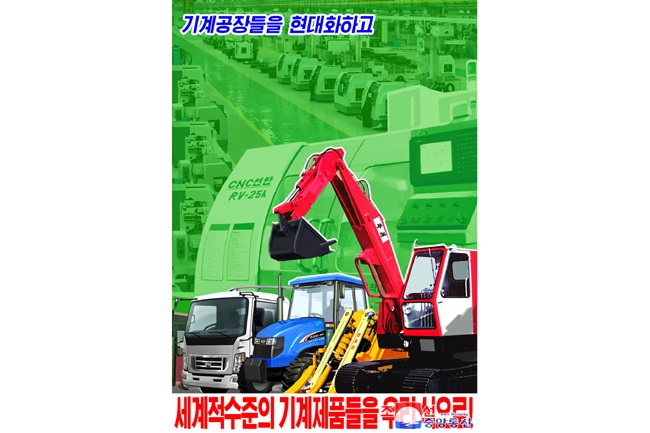 朝鮮民主主義人民共和国創建70周年を盛大に記念する国中の軍人と人民皆の大きな喜びを反映したポスターと、共和国の国力全般を新たな発展段階に引き上げる為奮闘する事を呼びかけるポスター、そして人民経済の自律性と主体性を強化し人民生活を向上させるという思想を盛り込んだポスター、重要プロジェクトの建設を促し科学技術強国、文明強国の高峰を目指して力強く進む軍人と人民の熱意を示したポスターもあります。