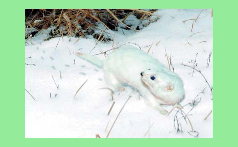 毛は短く密生し、毛色は季節ごとに変わります。冬は黒茶色の尾の先を除いた体中が白い色です。夏は背中が茶色で顎の下から体の下まで白色です。繁殖は春から夏までですが、一腹(ひとはら)5~7匹の子を産みます。