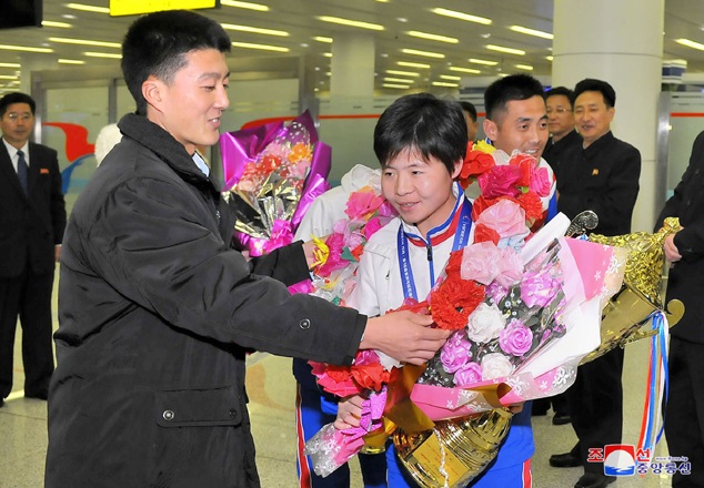 キム選手は、ファンヘ北道*1クムチョン郡*2に生まれ、幼い時から競走の名人と呼ばれました。14歳の時、ピョンヤン・スポーツ団にスカウトされ、現役生活を始めました。キム選手は才能の芽を見つけて伸ばしてくれた国に金メダルで報いる一念で、訓練に熱中しました。