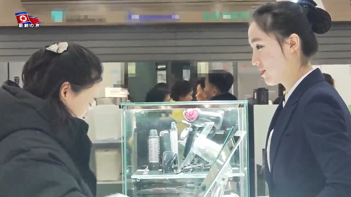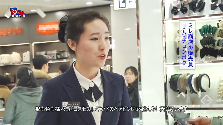 「形も色も様々な『コスモス』ブランドのヘアピンは女性たちに受けています。敬愛する金正恩総書記は商店に来て、女性たちがどんな形のヘアピンをもっと好むかを調べ、工場に注文して売るべきだと言いました」