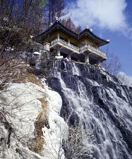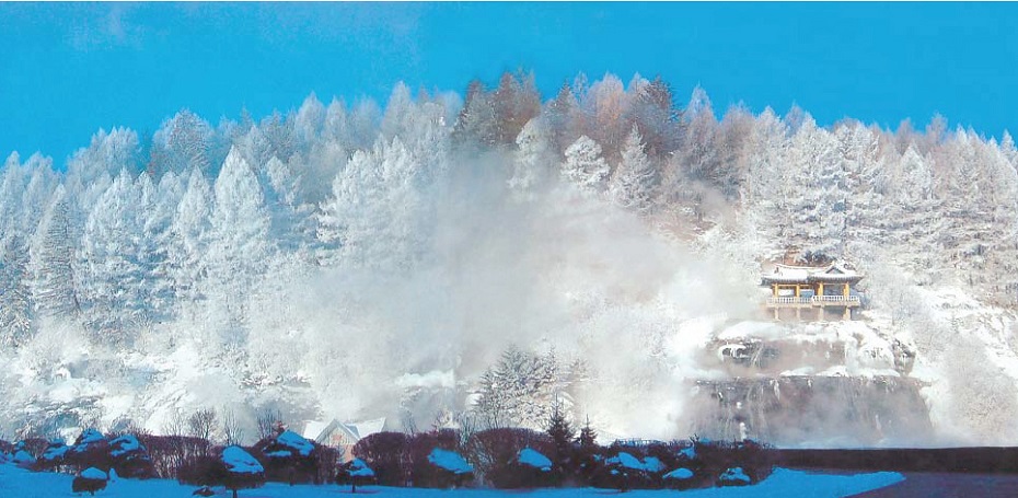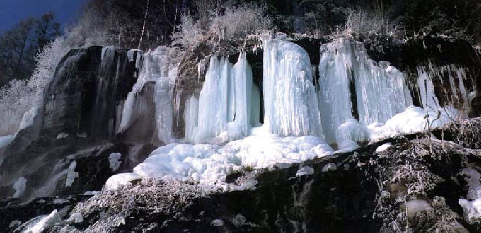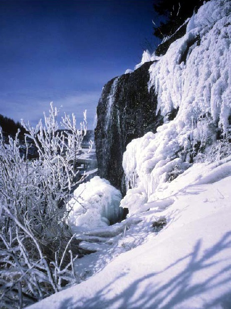 一番の見ものは冬の雪景色です。地下から流れ出た水が冷たい空気に当たって、谷間に白いもやが立ちこめ、樹氷の花を咲かせます。形も様々な氷、それと調和して流れ落ちる滝ともやは人々をうっとりさせるのに十分ですが、流れ落ちる水しぶきが陽光にきらめいて、虹が掛かるときの光景はまさに絶景というものです。滝から流れ落ちる水が作った絶壁の氷の柱も異彩を放っています。