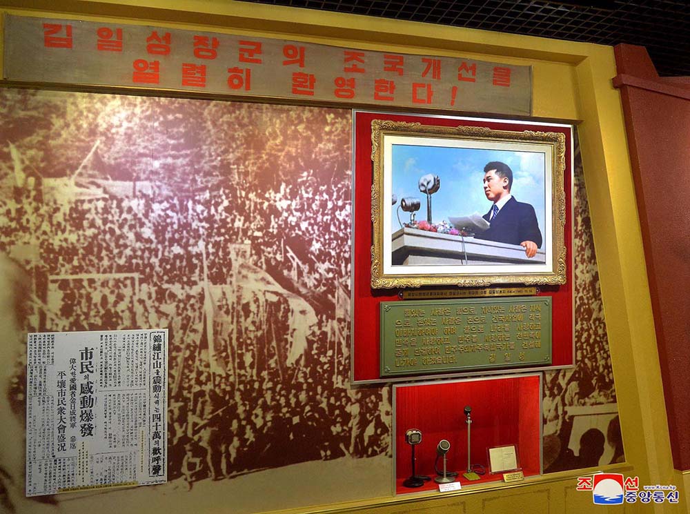 「朝鮮革命博物館は、朝鮮人民に朝鮮革命の誇らしい歴史を覚えさせる教育の拠点です。2017年に増改築された博物館には、朝鮮革命の誇らしい歴史を立証する数万点の物件資料が時代順に100余りの部屋に展示されています。これらのものはミニチュアとパノラマなど、色々な展示形式と照明効果でビジュアル感と立体感、リアル感を引き立てています。開館を控えた2017年3月27日、敬愛する金正恩総書記は朝鮮革命博物館を現地指導しました。博物館を見た総書記は、朝鮮革命の発展の過程がよく分かる、われわれの行く手が目に見えるようだと言いました。この日、総書記は、朝鮮革命博物館は一番の国宝だと強調しました」