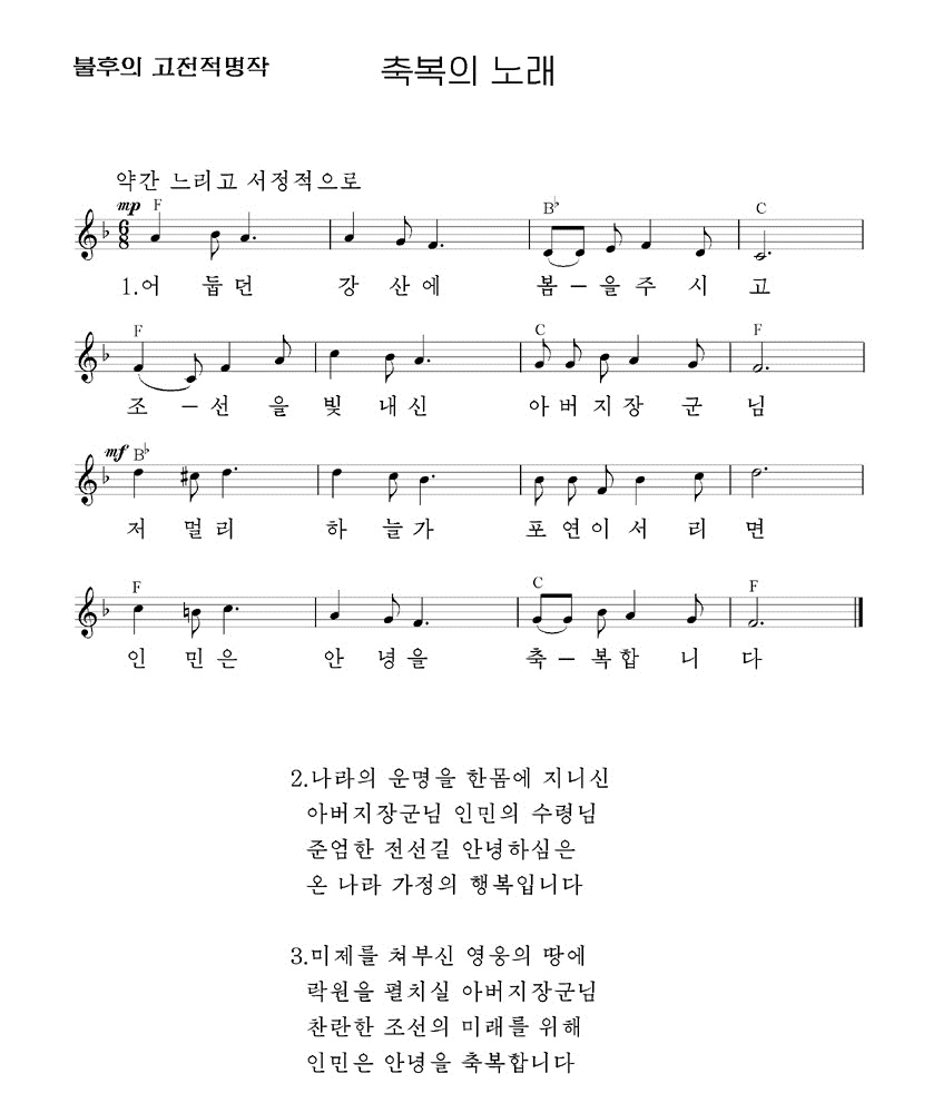 不朽の名作「祝福の歌」は金日成主席の身の安全は朝鮮革命の勝利と明るい未来を約束するという深奥な思想を詩と音楽で表していて、朝鮮人民の間に広く歌われています。