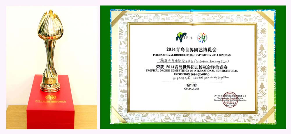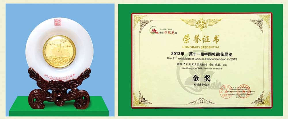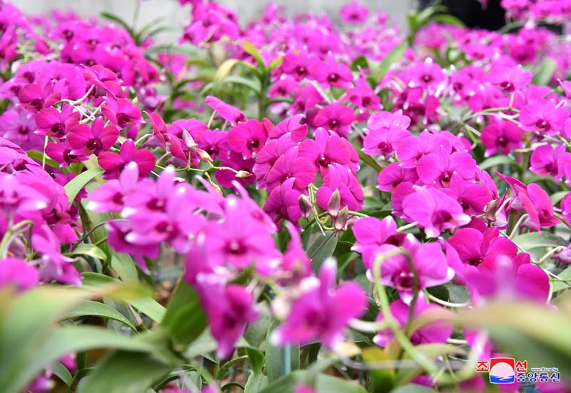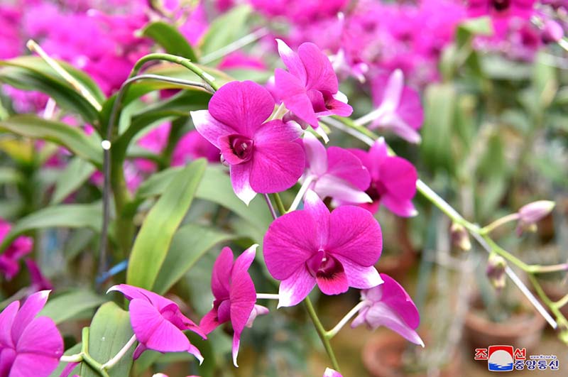 「金日成花は蘭科に属する多年草の熱帯植物です。茎の高さは30~70センチメートルで、葉の形は細長い帯状になっています。花は3~15の花房が総状花序を成して100日間ほど咲きます。花の直径は7~8センチメートルで、濃いローズピンク色です。金日成花はチュチェ71(1982)年4月に学会に正式に学名で登録されて、世界園芸界が認める有名な花に、世界最初の偉人称賛の花として広く知られるようになりました。金日成花は世界園芸博覧会、国際フラワー展で多くの賞状とカップなどを授かりました」