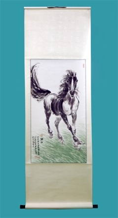 代表団は中国の有名画家の除悲鴻(じょひこう)の教え子で、当時の除悲鴻美術院の院長だった雷暁寧(らいぎょうねい)さんに依頼してこの贈り物を用意しました。贈り物には、強風にもめげず走る馬が描かれています。