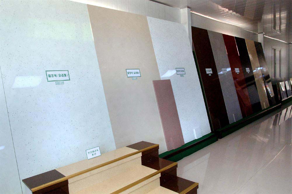チュチェ103(2014)年8月、敬愛する最高指導者金正恩委員長がこの工場を訪れました。金正恩委員長は、工場の各所で、生産と新製品の開発状況をつぶさに把握しました。各生産工程では、良質のタイルが生産されていました。
