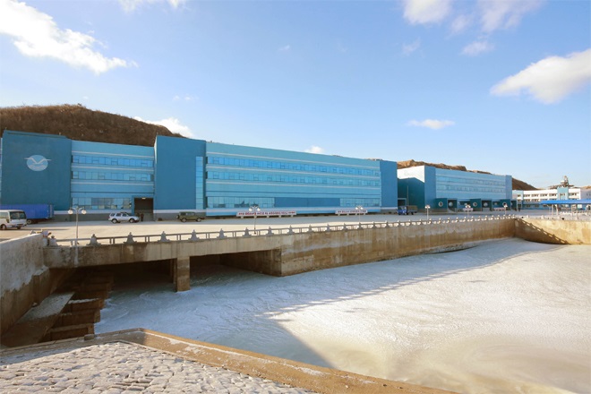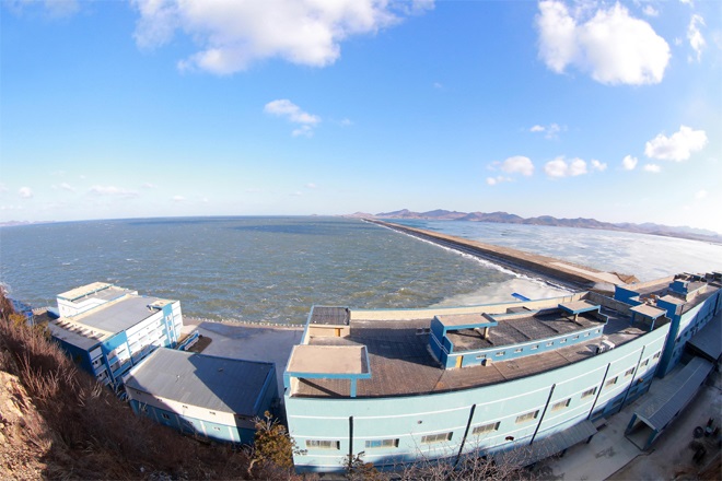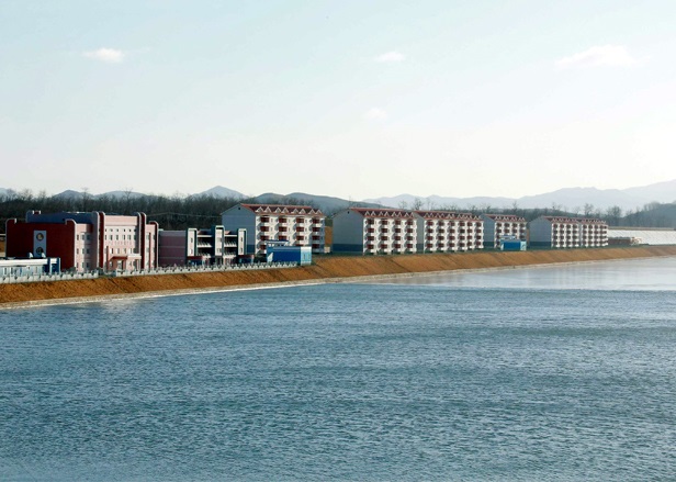 人民の食生活に潤いをもたらす色々な塩辛が生産されるクムサンポ塩辛加工工場も人民軍軍人が建てたものです。クムサンポ地区*4に鍬入れをしたときから軍人建設者は、決死の覚悟で無条件実行する精神を発揮して、島の間に堤防を新築したり、整理したりし、生産と生活用の建物、託児所、幼稚園、小学校、総合サービス施設、自然エネルギー発電所などを一年半と言う短い間に完工しました。