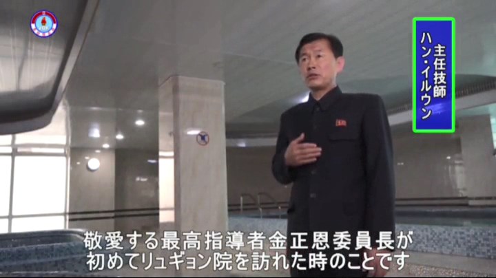 「敬愛する最高指導者金正恩委員長が初めてリュギョン院を訪れた時のことです。金正恩委員長はここ浴場も見て、浴槽の大きさと水量、風呂の加減も見ました。浴槽の縁が角ばっているのを見て人民が傷つくこともあるから、緩やかにするようにと言いました。そして、その年の7月、2度目にリュギョン院を訪れて、理髪室、美顔コーナーなど各所で人民のためのことで満足がない、より高い水準で遜色なくつくるようにと念を押しました」