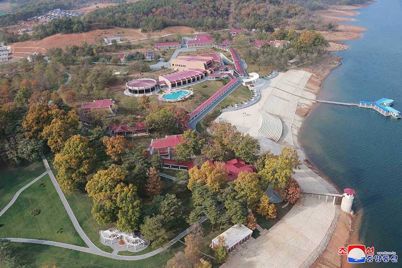 チュチェ108(2019)年8月のある日、工事が終盤で捗っているヤンドク温泉文化休養地の建設現場を訪れた総書記は軍人建設者の偉勲を高く評価しました。そして、建設に当たった人民軍軍人は国の守り手としてだけでなく、人民の幸福の創造者として栄える国づくりで愛国の足跡、偉勲の足跡をはっきり印していると評価しました。