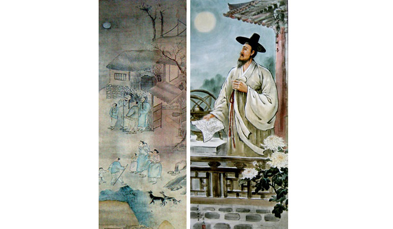 「小さい小正月の祭事は、農作の始まりを知らせるのを主として行われました。この日には、殻竿立てに色々な穀物の穂を吊るし、その下には豊作を祈る字を書いた旗を付けました。子供たちが殻竿立ての回りを歌を歌い踊りを踊りながら回ります。この日の朝早く肥やしを田畑に出す慣わしもありました。特に小正月の夜に、人々は山に登って、差し昇る満月を眺めましたが、これを月見と言います。昇る月を一番先に見た人に、その年の幸運があり、満月の形を通してその年の農作の出来具合を予言したりもしました。月見の後は、松明をかざして、野原の雑草を燃やす遊びもしました。これは、冬を越したイヌビエと雑草の種、害虫をなくすためのもので、農作に助けとなりました」