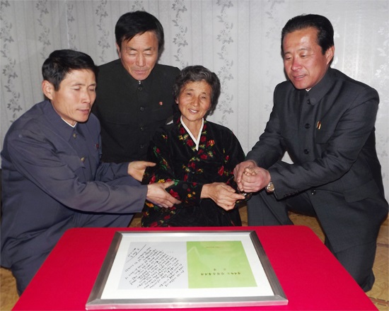 私は熱い思いを込めて敬愛する最高指導者金正恩元帥に手紙を差し上げました。手紙を見た元帥は直筆の返書を送りました。それは確かに心の中の悩み事もすべて推し量る優しい母、病気の子にもっと心を尽くす思慮深い母の愛情そのままでした。わが家では元帥の直筆を壁にかけておきました。毎日、その直筆を仰ぐと、その一つ一つのくだりが元帥の優しい声となって耳元に聞こえてくるようです。