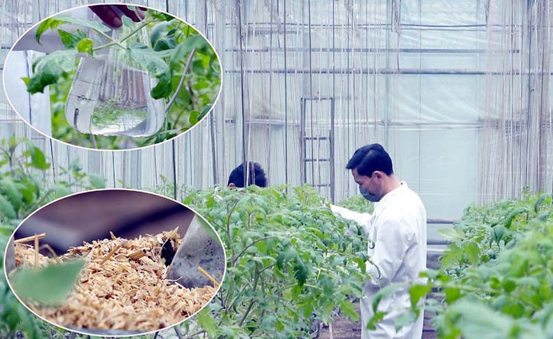 ピョンヤン野菜科学研究所では、作物への栄養液潅水方法と、籾殻の基質の物理的特性を作物の栽培により有利な方向へと改善する方法を含めて、無土壌栽培技術を一段と高めるための研究を深めています。