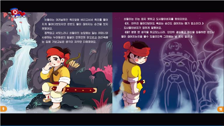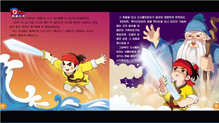 「この刀はペクトゥ山の鉱石をペクトゥ山の岩で研いで作ったこの世に一つしか無い霊剣だ。滝を良く見ると水が途絶える瞬間がある。その時、この刀で稲妻のようにその水を切り落とせ、そうすると分かるだろう」