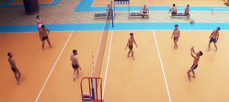 ピョンヤンの都心を流れるテドン川*1に氷が張り、柳で緑いっぱいだった岸辺も冬枯れしています。寒風が身にしみるこの冬も、ムンス遊泳場の中には夏の光景が広がっています。まぶしい日差しが差し込む屋内遊泳場に入ると、屋外と同じく遊泳施設が揃っています。