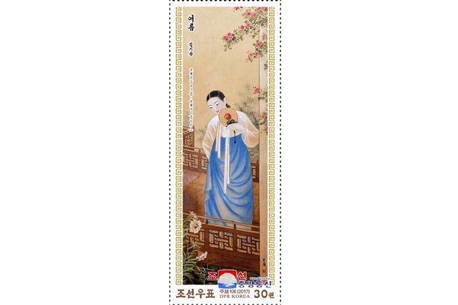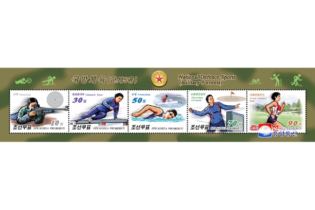 共和国で、軍事5種の国防スポーツを表した新切手が出ました。ブロックシート1種で、上の部分に『国防スポーツ軍事5種』と書かれた切手には、射撃、ハードル競争、水泳、手榴弾投擲、クロスカントリーの場面が描かれています。朝鮮の選手達は近年、世界軍事5種選手権大会に参加して好成績を記録しています。一方、朝鮮の名山『七宝山』の秋と爽快な『ウルリムの滝』を描いた風景画と、季節毎の民族衣装を纏った女性達を描いた美術作品がデザインされた切手6種も発行されました。