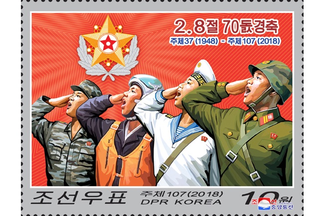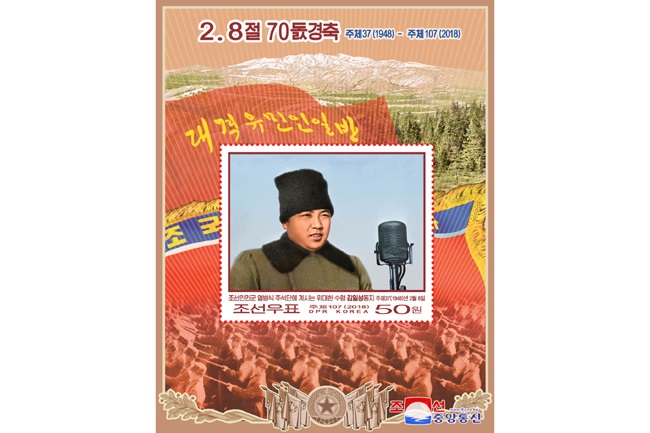 小型シート2種と切手1種で、切手の上の部分には「2月8日 70周年記念 チュチェ37(1948)~チュチェ107(2018)」と書かれています。