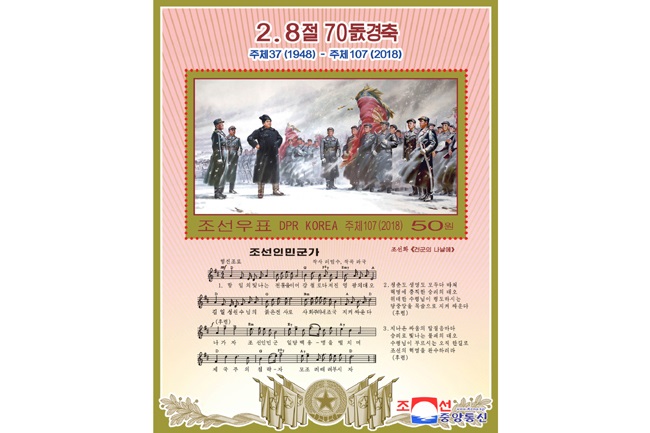 国の解放後、軍隊建設の路線を新しい国造りの3大課題の1つとし、その実現へと正しく導いた金日成主席の不滅の業績を伝える朝鮮画「軍隊建設の日々に」をテーマにした小型シートの下の部分には、朝鮮人民軍歌の歌詞と楽譜が描かれています。