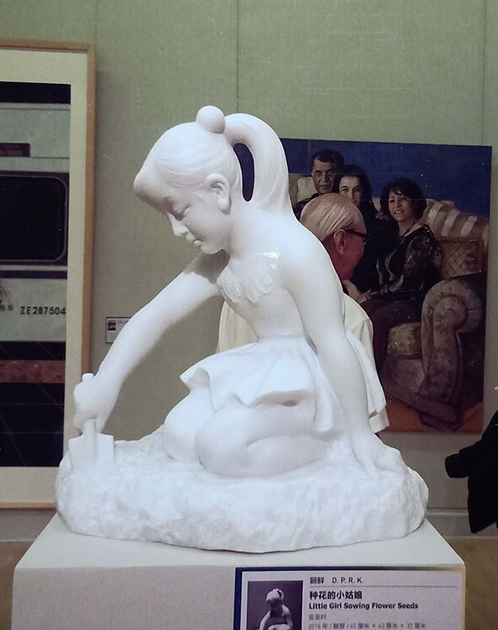 彫刻「花を植える少女」です。美術アトリエセンター・マンスデ創作社の金正日賞、人民芸術家の称号受賞者のキム・ソンシさんの手になるものです。