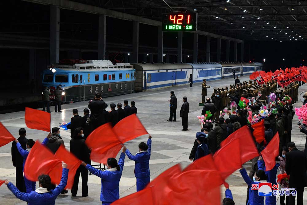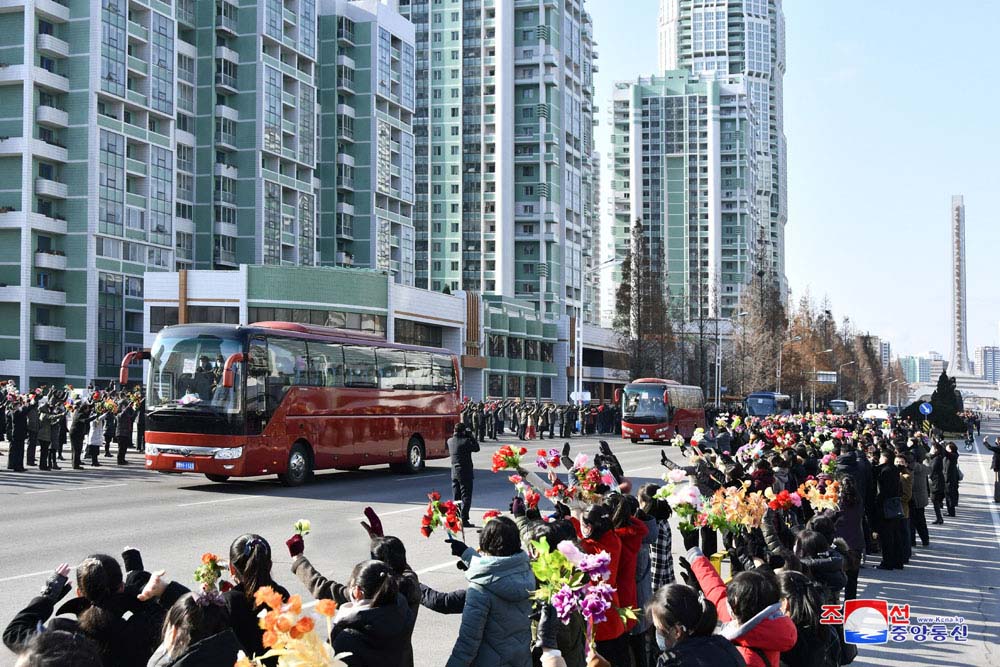 11月20日、被害復旧現場で偉勲を立てた首都の党員たちがピョンヤンに帰ってきました。首都市民が熱く出迎えました。