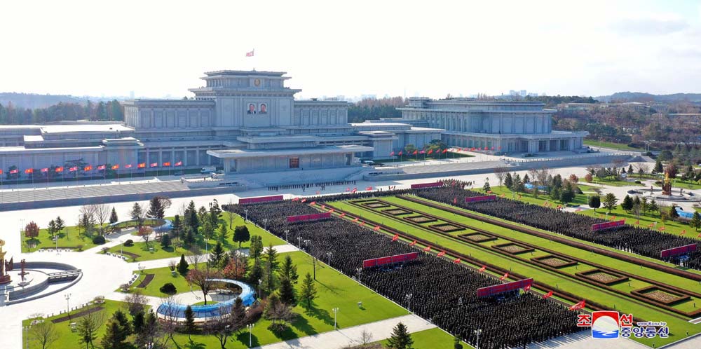 一同、クムスサン太陽宮殿の広場で金日成主席と金正日総書記に勝利を報告しました。