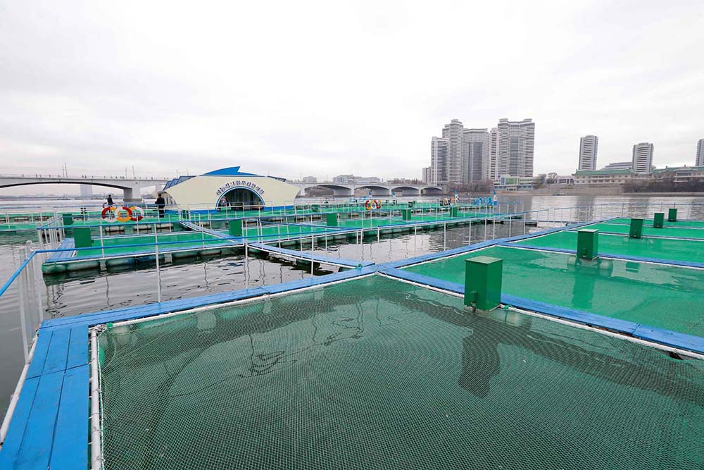 ピョンヤンの自慢であるテドン川*1の異彩を放つ風景の一つは、移動式囲い編みの養殖場です。養殖場ではハクレンと皮鯉、草魚など色々な魚を養殖しています。