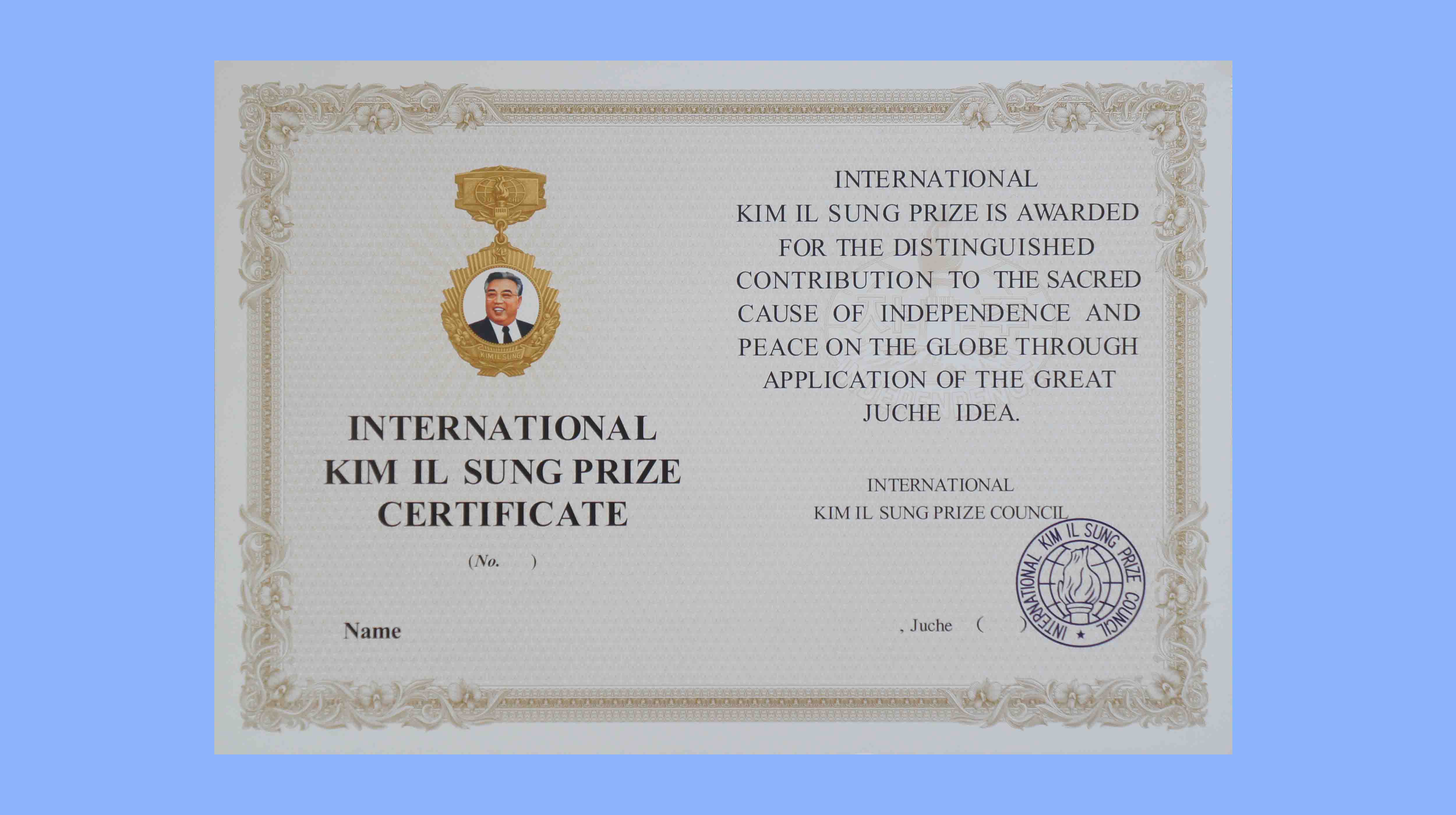 国際金日成賞は賞状と金メダル、記念品からなっています。国際金日成賞は世界の自主化と平和、友好を実現し、人類の進歩と繁栄を成し遂げることに特別寄与した政界など社会各界、学界の著名な活動家、チュチェ思想支持者に授けられます。対象は国際金日成賞理事会で推薦し、決定します。国際金日成賞理事会は書記長と7人の理事からなり、本部はニューデリーにあります。