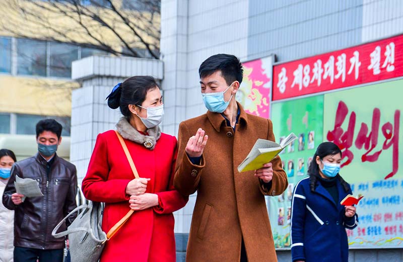 爽やかな朝、勤めに出るピョンヤン靴下工場の従業員です。
