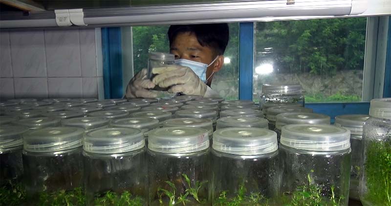 国土の大部分が山である朝鮮は、木材植物と野生の果実、油脂原料の植物、薬用植物、香料植物など、経済的価値のある植物資源に恵まれています。そこで各地の森林科学研究所で、経済植物資源を効果的に利用し、保護、増殖させるために励んでいます。