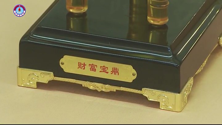 工芸品の台の前には中国語で「財富宝鼎」と書かれています。