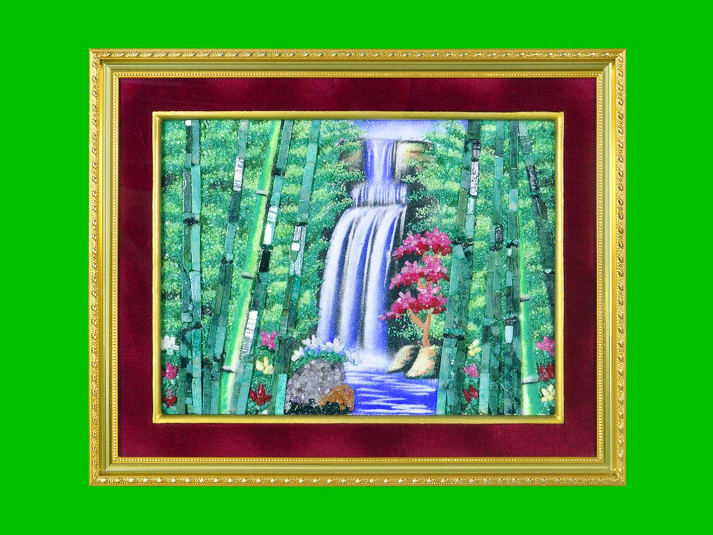 宝石画は、ミャンマーのマンダレー州の西部に位置する滝を表したものです。滝と共に、竹林もデザインされています。ミャンマーで滝は繁栄と発展、竹は長寿を象徴する、と言います。世界的に有名な宝石産地であるミャンマーではルビー、エメラルド、翡翠輝石など様々な宝石で作った美術作品を尊敬する人に贈る慣わしがあると言います。