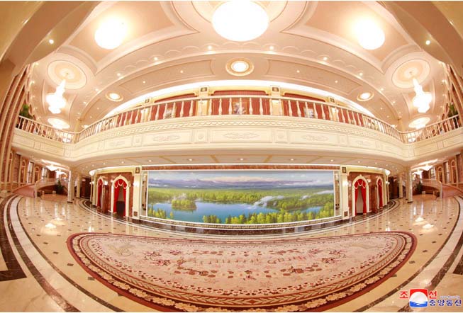 チュチェ107(2018)年10月、開館間近の劇場をまたもや訪れ、長時間かけて劇場の外と中を見ました。金正恩委員長はレトロでエレガントな佇まいの劇場の全景を眺め、人民が劇場に来て見れば大変喜ぶだろうと嬉しく言いました。そして、演奏ホールの各位置でサムジヨン管弦楽団の演奏を直々、聞いて音響の特性を比べて見ました。