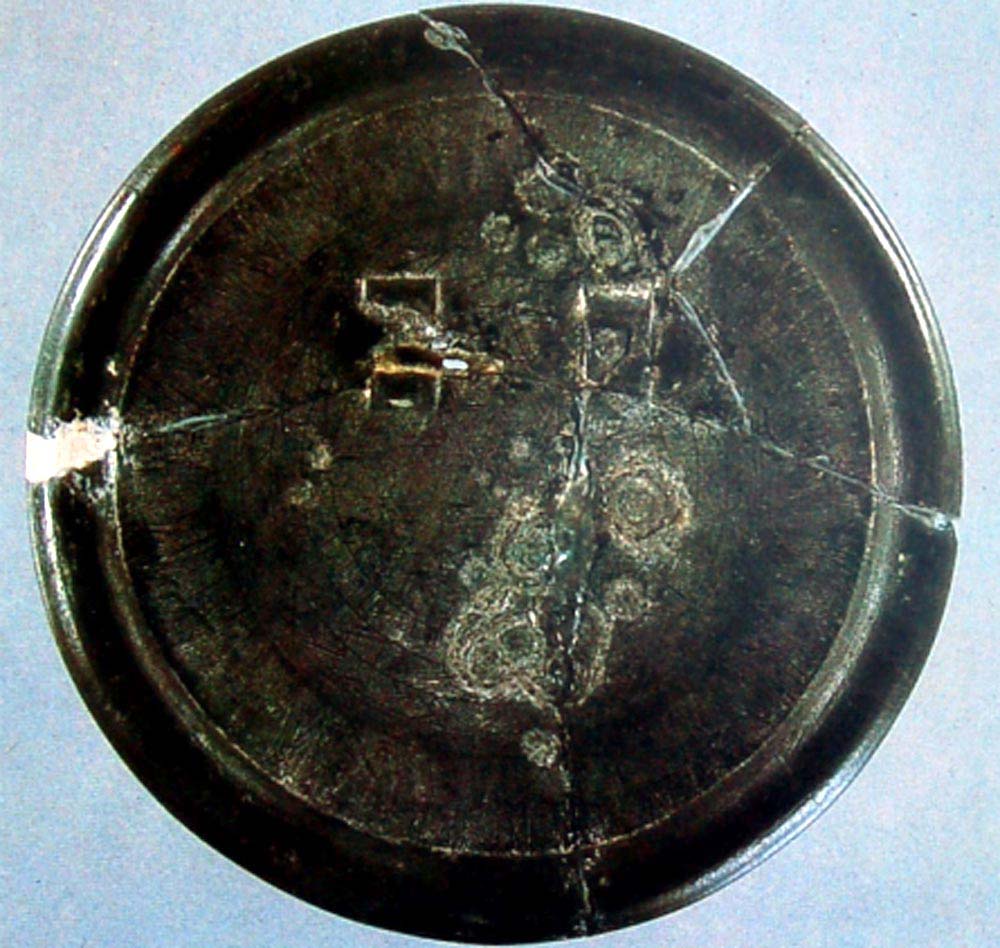 鏡の表面は滑らかに加工して、ものがよく映るようにし、裏面はユニークな文様で飾りました。裏面の縁には、細い線の繊細な彩文が刻まれています。彩文は三角形、円形などの幾何学的なものですが、数多くの円や直線のうち、歪んだり、重なったりしたものは一つもありません。