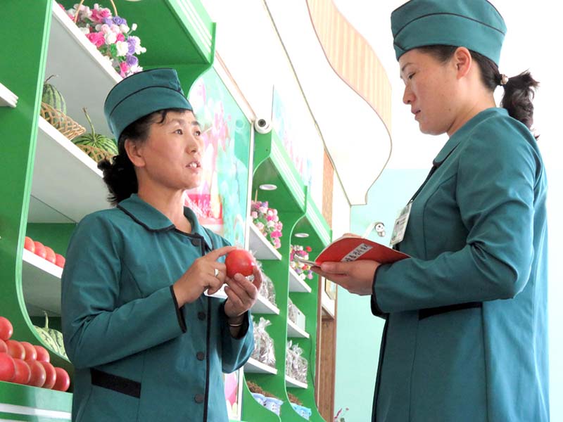 「1969年10月4日、金日成主席はうちの店を訪れました。当時の店は狭い上に作りも不向きなので、裏庭にまで野菜と果物があちこちにうずたかく積まれていました。これを見て顔を曇らせた主席は、店に野菜が多く入るときは、臨時の労力を動員してでもよく選別すべきだと言いました。そして、野菜やリンゴなどの商品を一度に多量受けつけてためておかず、卸売り所から一定量を仕入れて売るべきだ、低質のリンゴは加工して売るべきだと念を押しました。そして移動式売り場を多く設置することなど、サービス関連の貴重なことを教えました」