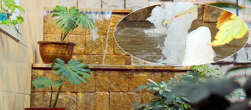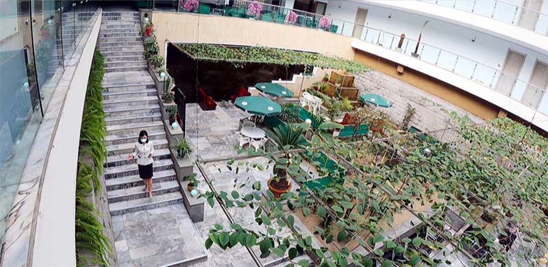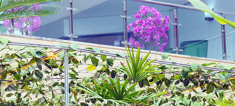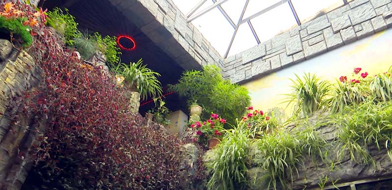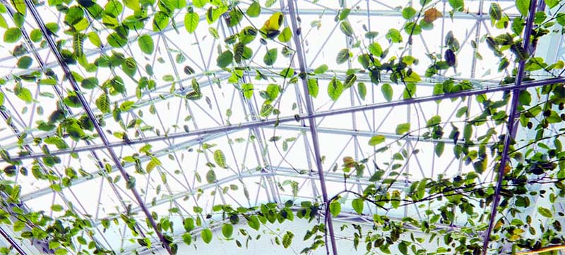 特徴と言えるのは前の鉢植え形式の緑化でなく、花壇を作り、室内の観賞植物を区画正しく配置する方法で室内緑化を行っていることです。日差しを好む植物は日照率が8時間以上になる所に配置し、陰に強い植物は日照率が5時間ほどの所に配置する方法を取り入れています。そしてサービスホールに噴水と滝を作る方法で植物に必要な大気湿度を賄っています。