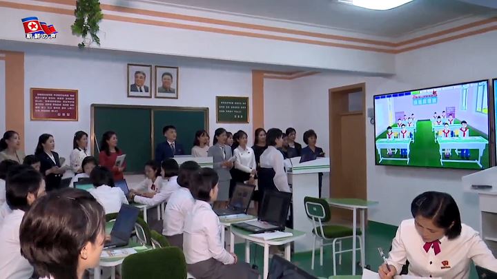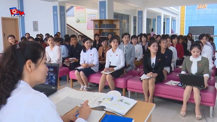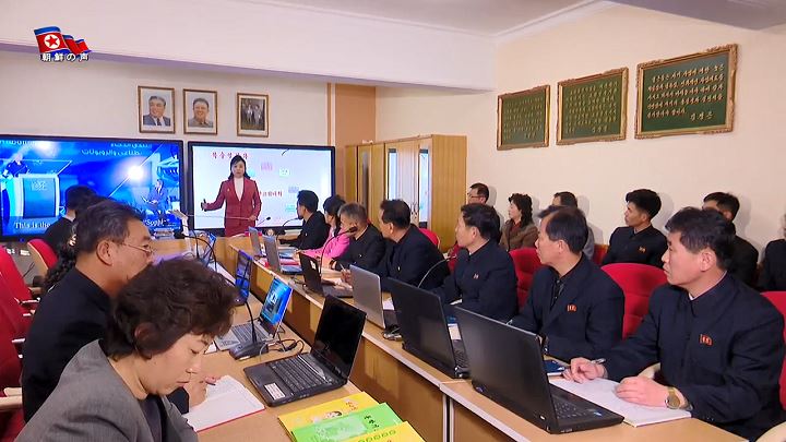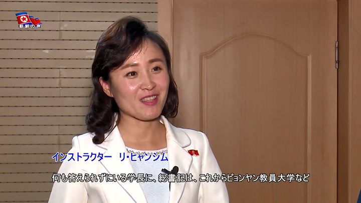 「大学に再教育学部が設けられたのには訳があります。2018年1月16日、大学を訪れた敬愛する金正恩総書記は、教育コントロール室と学長の部屋にも寄りました。その時、学長が多機能教室で行われている教育方法に10余りの最新の教育技術を取り入れたことについて金正恩総書記に説明してあげました。説明を聞いた総書記は、最新のこの教育技術を現職の教員は知っているか聞きました。学長は答えられませんでした。事実、その時まで大学で編み出した最新の教育技術を現職の教員に導入するというのは考え及ばなかったことでした」