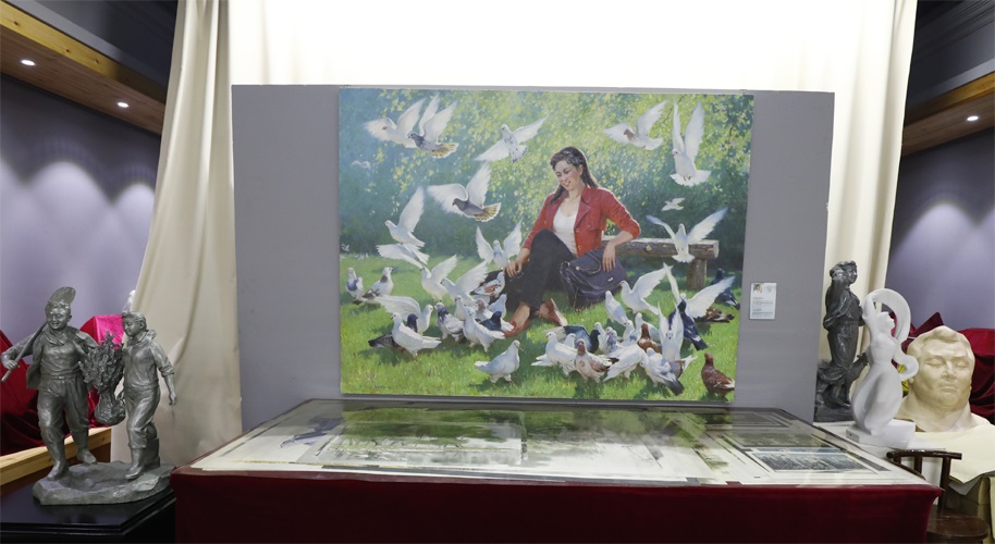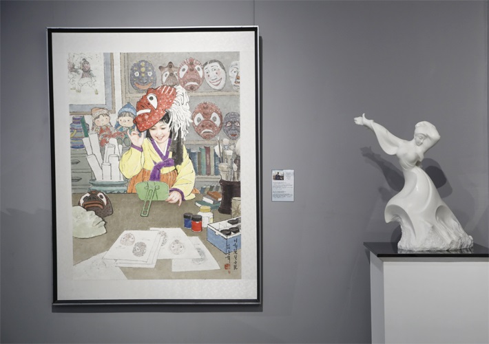 展示会には朝鮮の人民芸術家、功労芸術家の称号を受けた人と貫禄がある美術家が創作した朝鮮画、油絵、彫刻、焼き物などが展示されていました。朝鮮画「頼もしい乙女の選手たち」、「チルボ山の朝」、「父」などの作品は朝鮮画の優れた技法を見事に生かしたものです。また躍動する朝鮮の今をリアルに描いた油絵「公園で」、「未来の建築家」、「海辺で」、「公演を控えて」は朝鮮の油絵の発展のレベルをそのまま示しました。