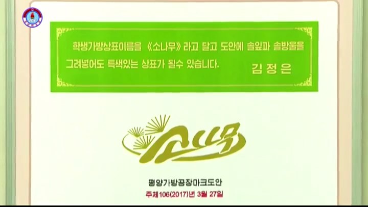 チュチェ106年(2017)1月4日、工場を訪れた金正恩総書記は生徒・学生用ランドセルのブランドを松の木の意味の『ソナム*1』と名付けて、「松の葉と実を描くならユニークなブランドになれる」とヒントを与えました。こうしてソナムという文字に3本の松葉を描いたブランドのデザインが生まれました。