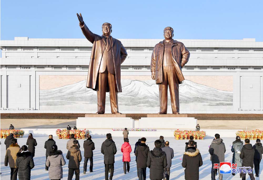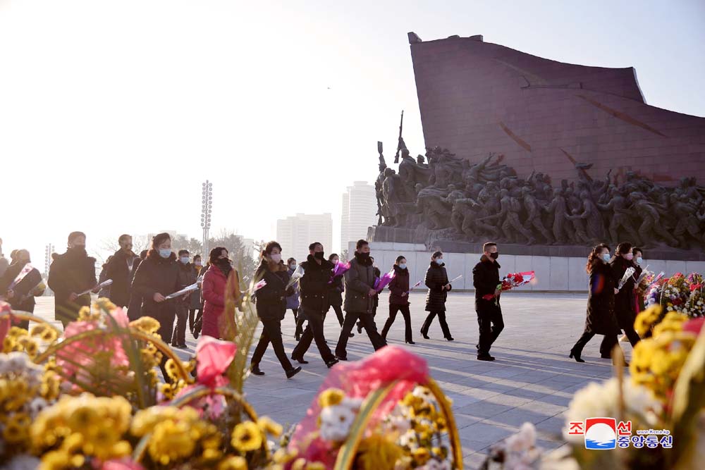早朝から社会主義朝鮮の永遠の映像で人民の優しい父である偉大な金日成主席と偉大な金正日総書記の銅像のあるピョンヤンのマンスデの丘を訪れる人たちが後を絶ちません。