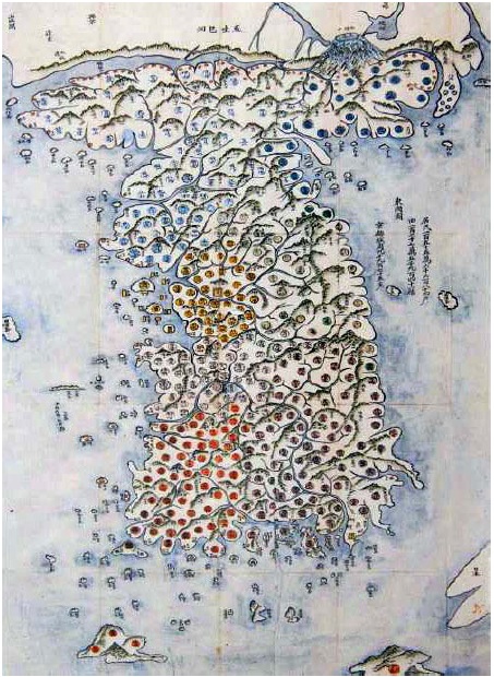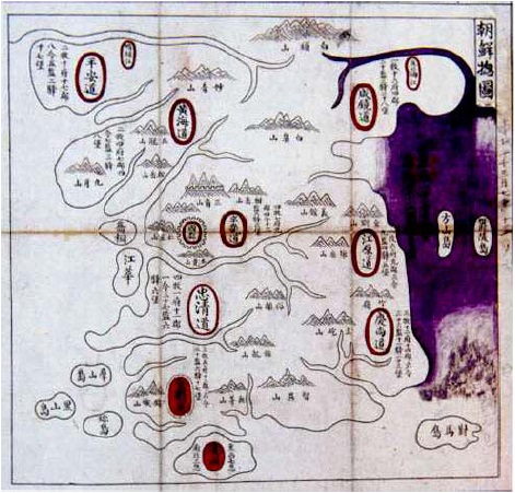 これらの地図には、トク島がウサン島*2、パンサン島、チャサン島、チョンサン島*3、ジョンサン島などに表記されています。代表例は朝鮮全図で、15~16世紀の「8道総図」と17~19世紀の「東国図」と「8道全図」などです。地方地図の「カンウォン道」地図にもトク島がウルルン島*4と共に残らず表記されています。これはトク島とウルルン島が昔ながらカンウォン道に属され、そこの住民のこの島への往来が頻繁だったことを見せています。