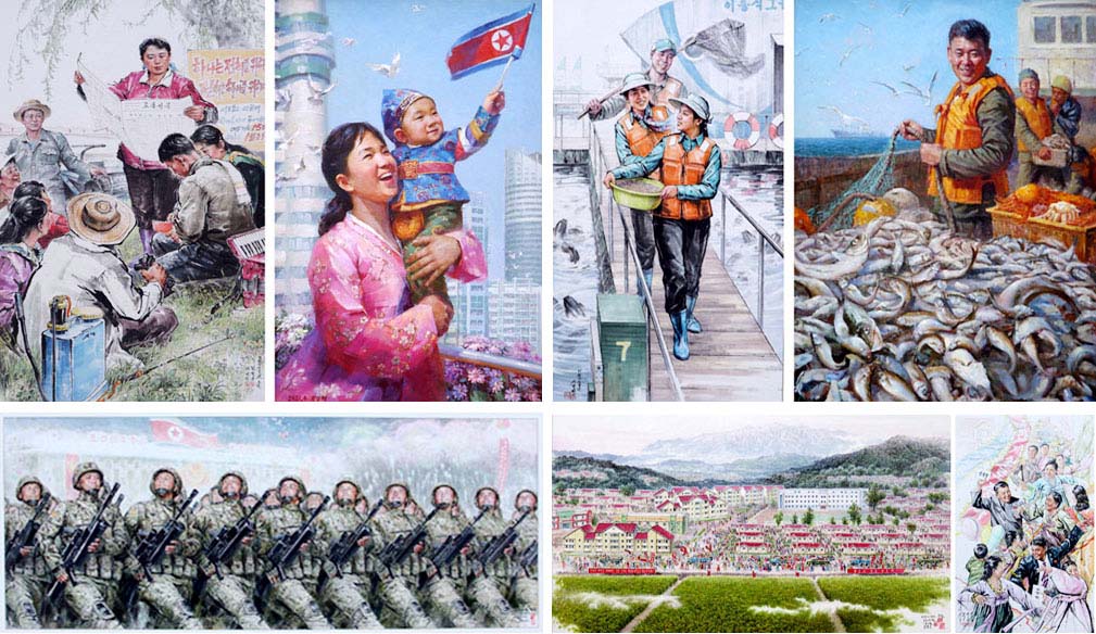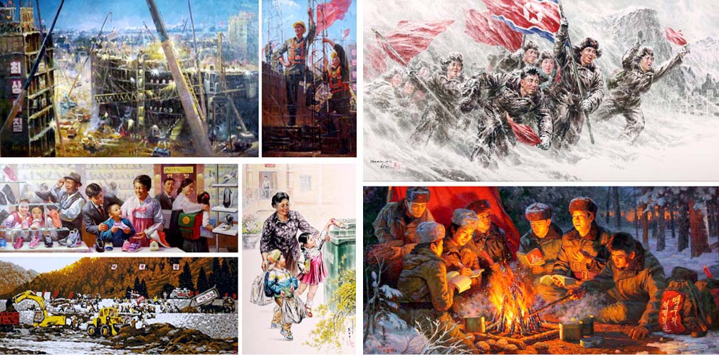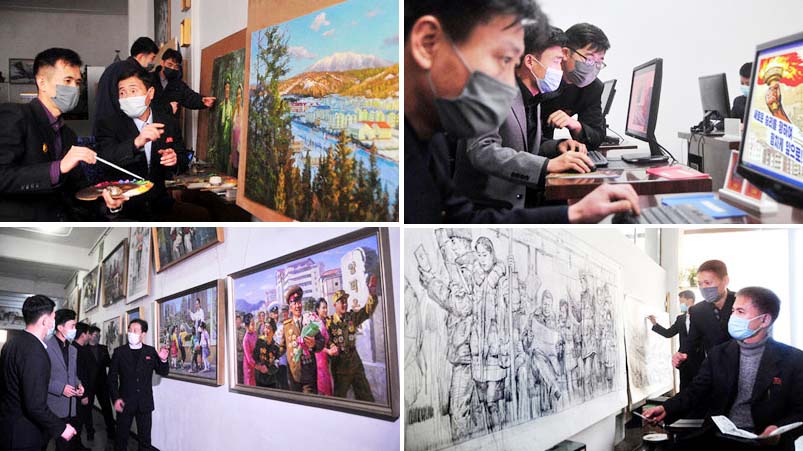 時代の息吹を絵で表している中央美術創作社の人たちです。創作社では、この地に人民愛の歴史を綴っている朝鮮労働党に対する絶大な信頼性と社会主義の国に生きる誇りを感じている朝鮮人民の思想と志向に合う名作に完成するため励んでいます。