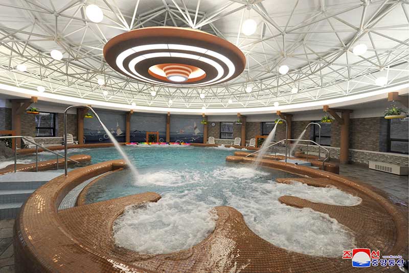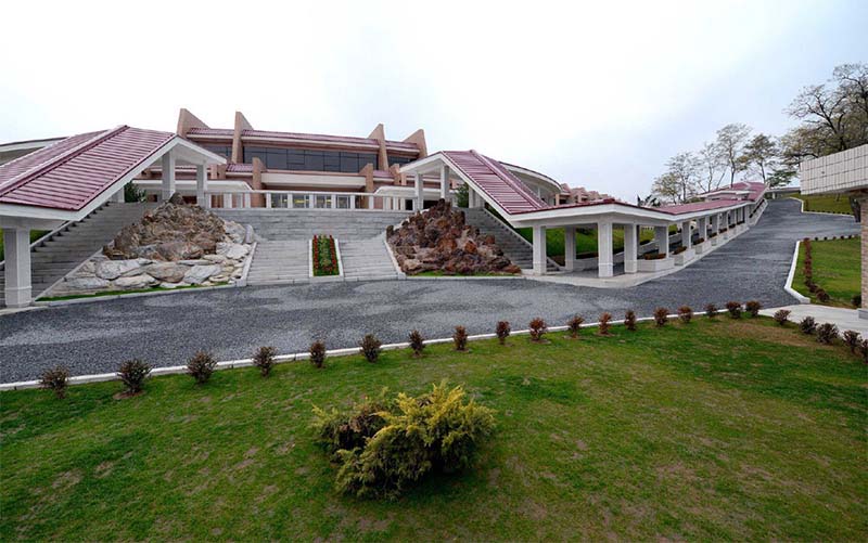 チュチェ103(2014)年5月と8月、建設現場を訪れた金正恩総書記は休養所の建物と施設を世界に誇るだけある最高のレベルのものに建てなければならないと言って、現場をつぶさに見ました。その献身と労苦があって、ヨンプン科学者休養所*2は4ヶ月あまりの間に見事に建てられました。