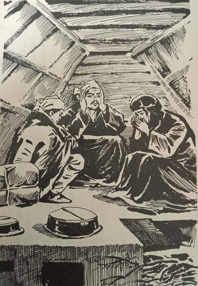 小屋はますます寒くなり、体がカチカチに凍えてきました。かれらは顔を股ぐらに埋めて夜を明かしました。もう、あごがこわばって口をきくこともできません。しだいに気が遠くなり、3人の行商人は凍死寸前です。