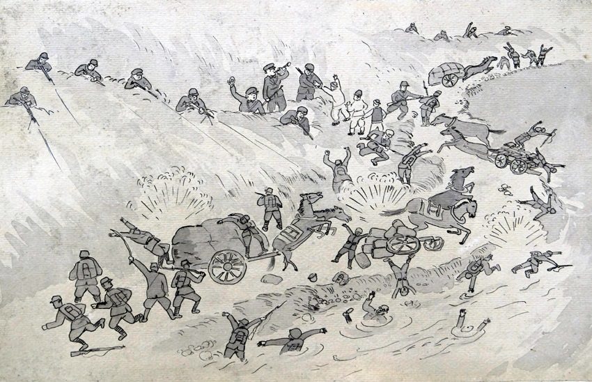 作品は抗日遊撃隊員の戦闘行動を幅広く見せるために俯瞰図の形式で敵味方がすぐ分かるような構図となってるだけでなく、戦闘過程の細部にいたるまで繊細に描いています。