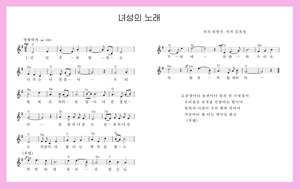 歌は、新しい朝鮮の主人になった女性たちのたくましい姿と燃えるような愛国の情熱をポピュラーな生活用語で表しています。1番と2番の歌詞の、「燃える愛国心胸に」というくだりを通してもそれがよく分かります。明るく朗らかなワルツのメロディーによって、歌の思想的内容を浮き彫りにしています。