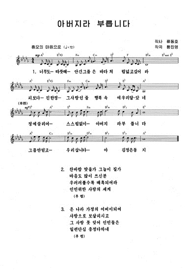リュ・ドンホ作詞、人民芸術家称号受賞者のファン・ジンヨン作曲の「父と呼びます」、この歌はチュチェ106(2017)年に出ました。敬愛する最高指導者金正恩元帥を父と呼び慕い、その許に生きる朝鮮人民の幸せそうな姿を素朴ながらリアルに歌いあげています。