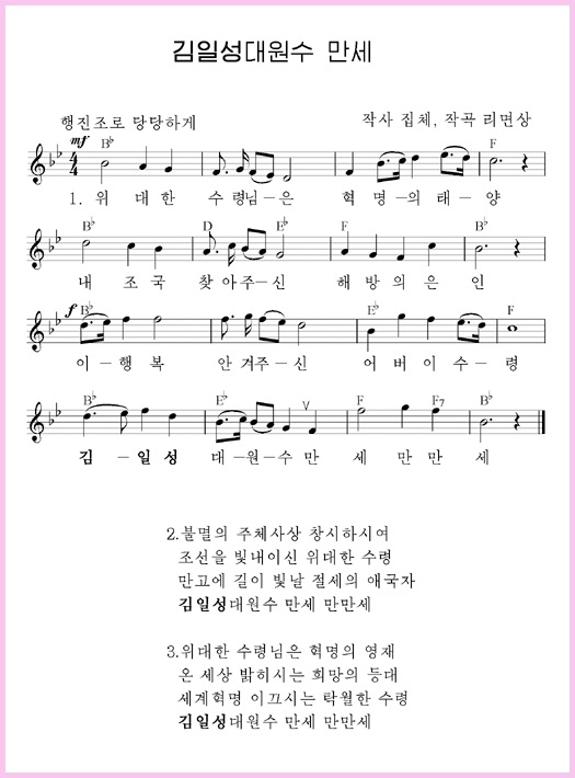 数千年の歴史で始めて迎えた金日成主席を革命の偉大な太陽と仰ぎ、主席が奪われた国を取り戻し、朝鮮人民にこの世にうらやむものない幸せな生活をもたらしたことについて熱く歌っています。