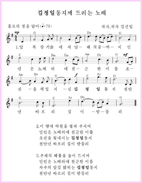 歌の高い思想性・芸術性は、敬慕の念あふれ、荘重で強い意志が込められたメロディーによっていっそう強調されています。特に、メロディーの後半で、情緒の高低を幅広く拡大し、歌のクライマックスを総書記の名と一致させることで、不世出の偉人を代をついで永遠に仰ぎ慕う朝鮮人民のひたすらな思いをそのまま見せています。