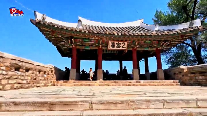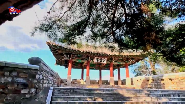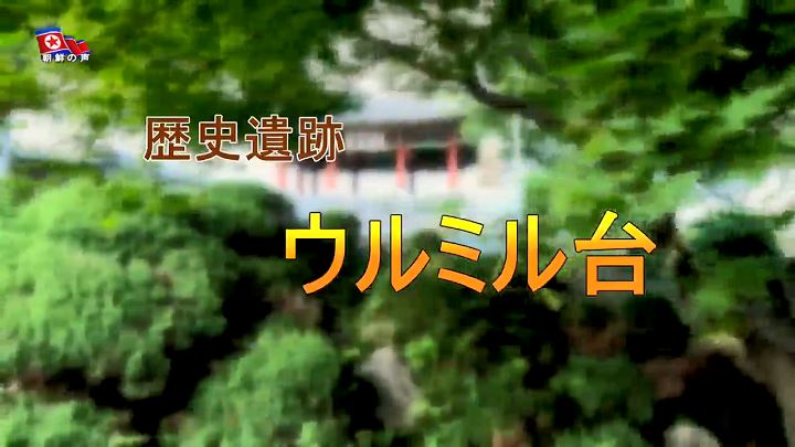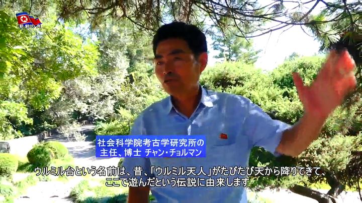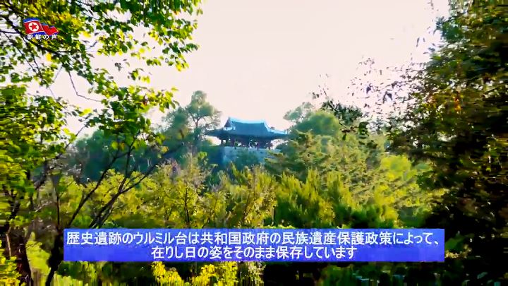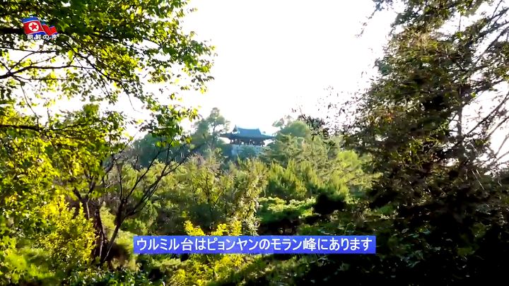 「ウルミル台は6世紀中頃、コグリョ(高句麗)がピョンヤン城を築造する時、中の城の北側の将台として初めて建てられ、その後、1714年に建て直されました。ウルミル台という名前は、昔、「ウルミル天人」がたびたび天から降りてきて、ここで遊んだという伝説に由来します」